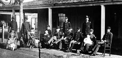Prescott, whose population was 6500 in 1907, is picturesquely situated in a beautiful valley among pine-clad mountains. It enjoys a delightful climate, and is a thoroughly modern city. Railroad shops and factories employ many men, and the city is the center of supply for one of the important mining districts as well as the trade center for many towns along the Santa Fe, Prescott and Phoenix Railway and its branches. Among these are Humboldt, Mayer, Crown King, Skull Valley, Kirkland, and Congress.